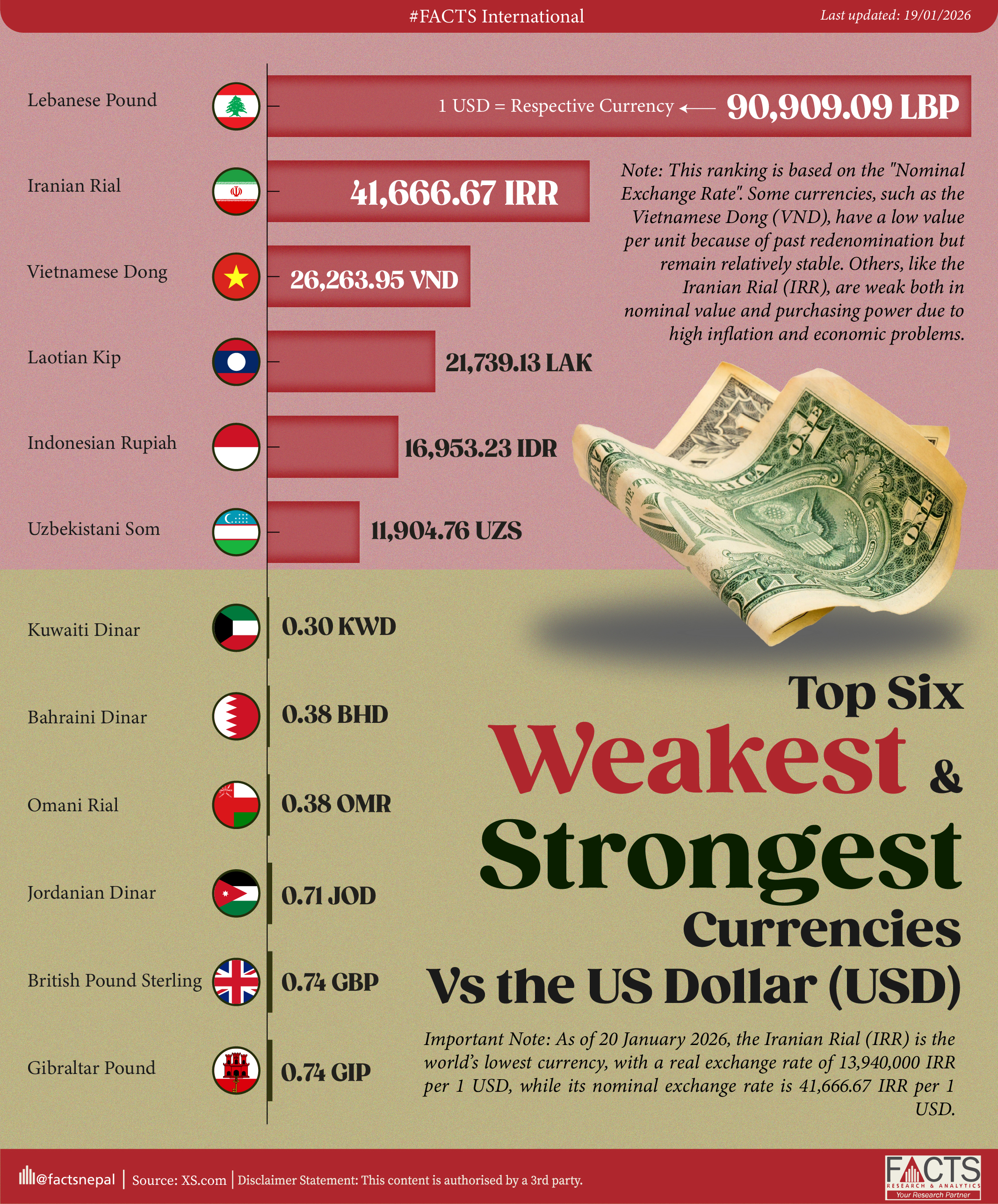 As of 19 January 2026, the top six strongest and weakest currencies against the US dollar are ranked by nominal exchange rates, where some appear weak due to a high number of units per dollar, while others reflect deeper economic problems such as high inflation.