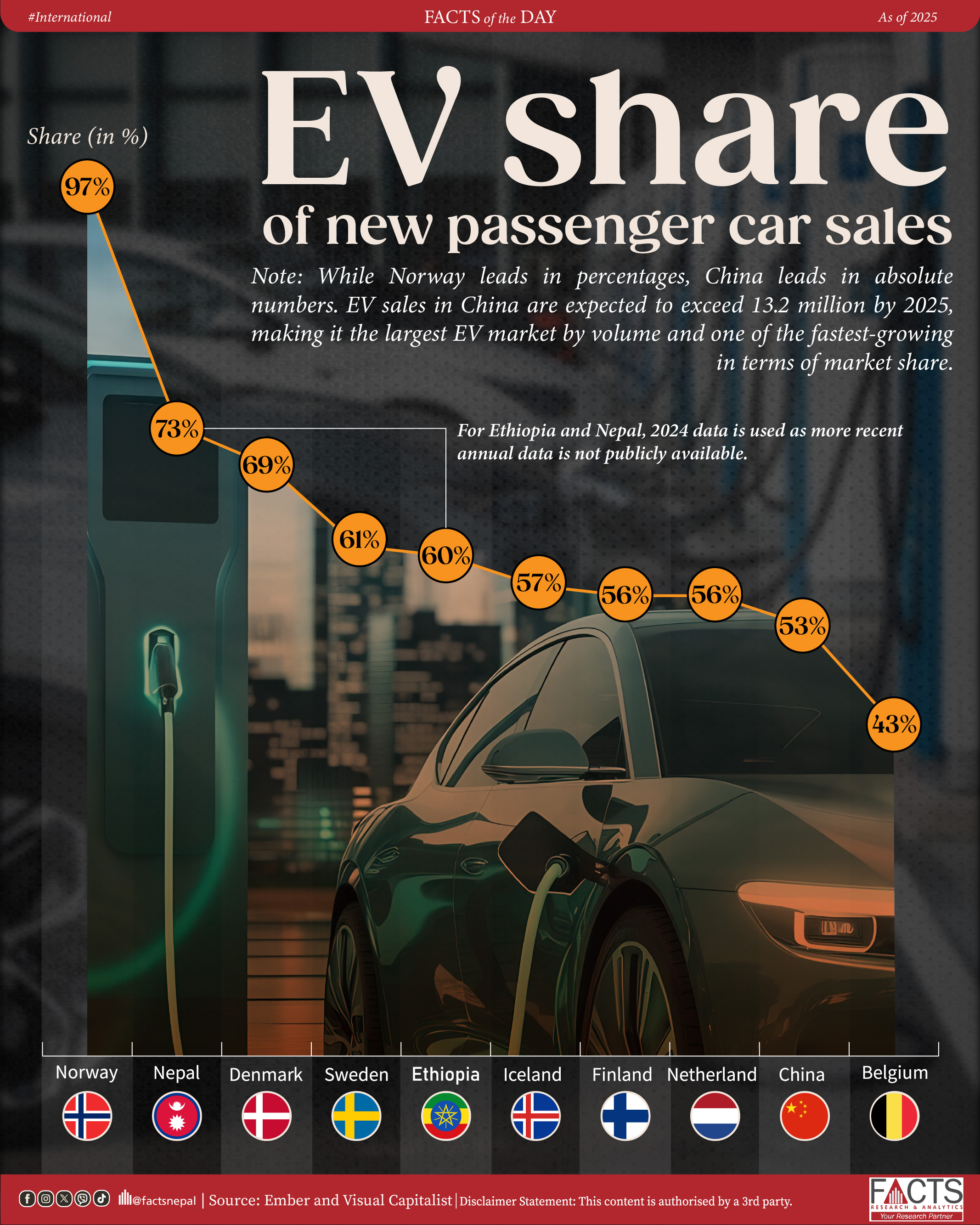 - While Norway leads in percentages, China leads in absolute numbers. EV sales in China are expected to exceed 13.2 million by 2025, making it the largest EV market by volume and one of the fastest-growing in terms of market share.