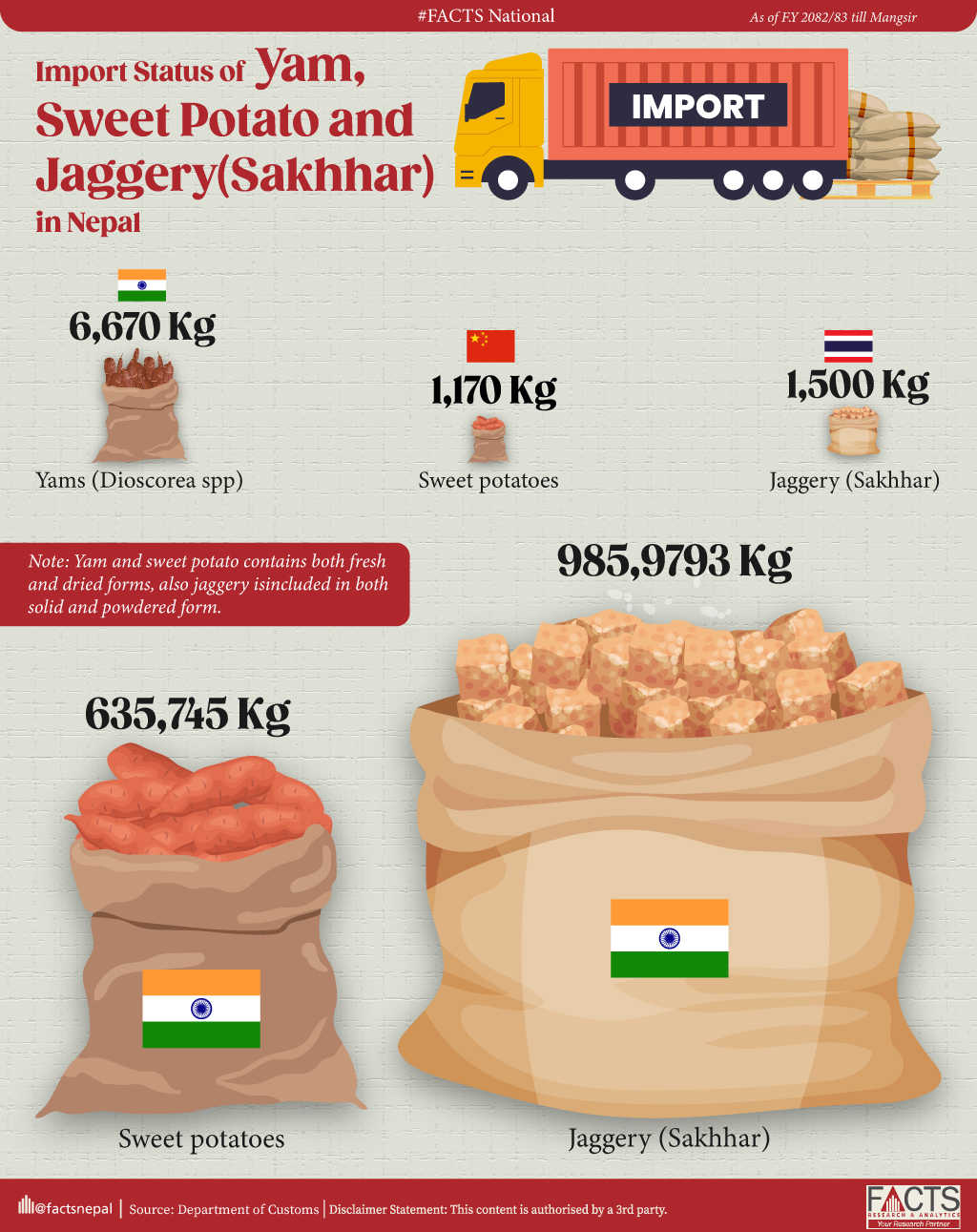 - Nepal's imports of yam, sweet potato, and jaggery up to Mangsir of FY 2082/83 are largely sourced from India, with smaller quantities imported from China and Thailand.