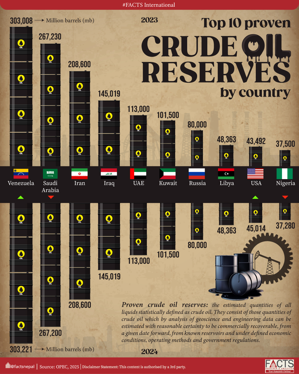 - Venezuela has the world’s largest proven crude oil reserves, about 303 billion barrels, followed by Saudi Arabia, Iran and Iraq.